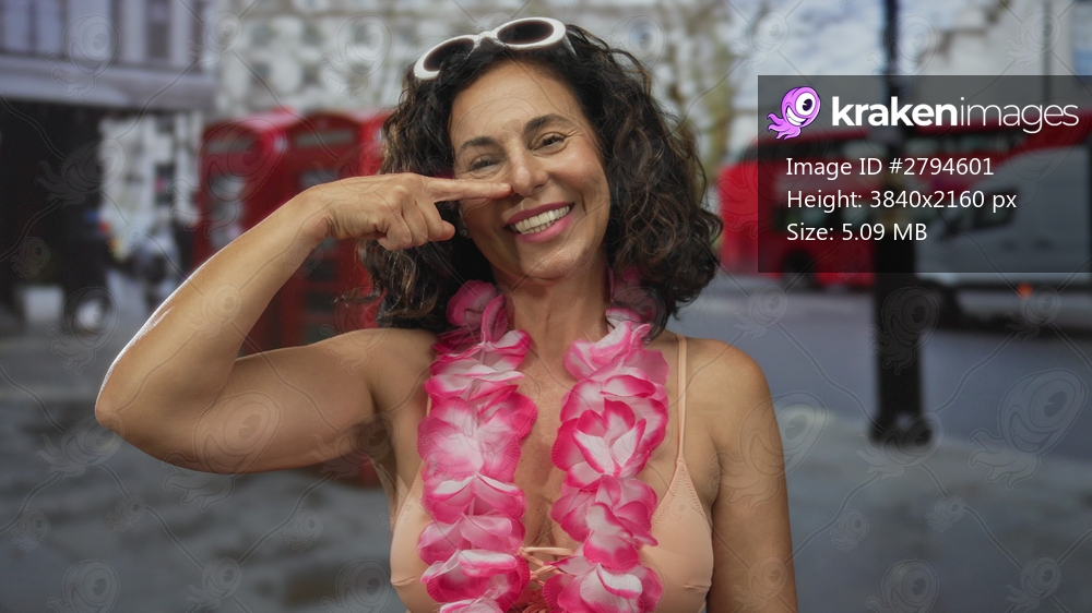 Woman wearing pink bikini top and hawaiian lei pointing finger to nose on city street; playfulness vacation fun joy.