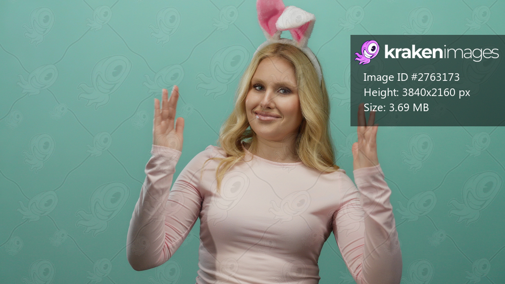 Woman wearing pink bunny ears playfully gestures with hands against bright green background, exuding cheerful and lighthearted vibe in a fun setting