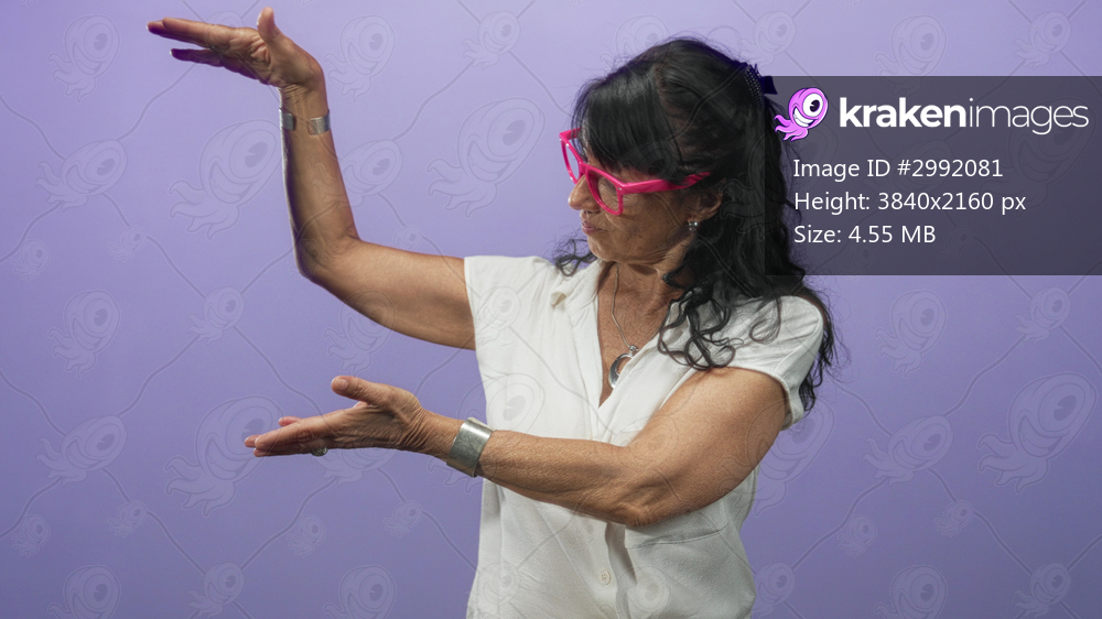 Woman wearing pink glasses holding hands apart, palms up and arms framing space in a studio; playful confidence.