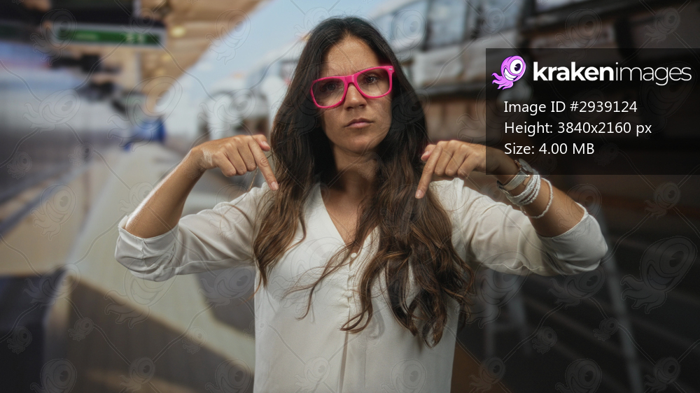 Woman wearing pink glasses and long wavy hair points both fingers down in studio; personal confidence empowerment.