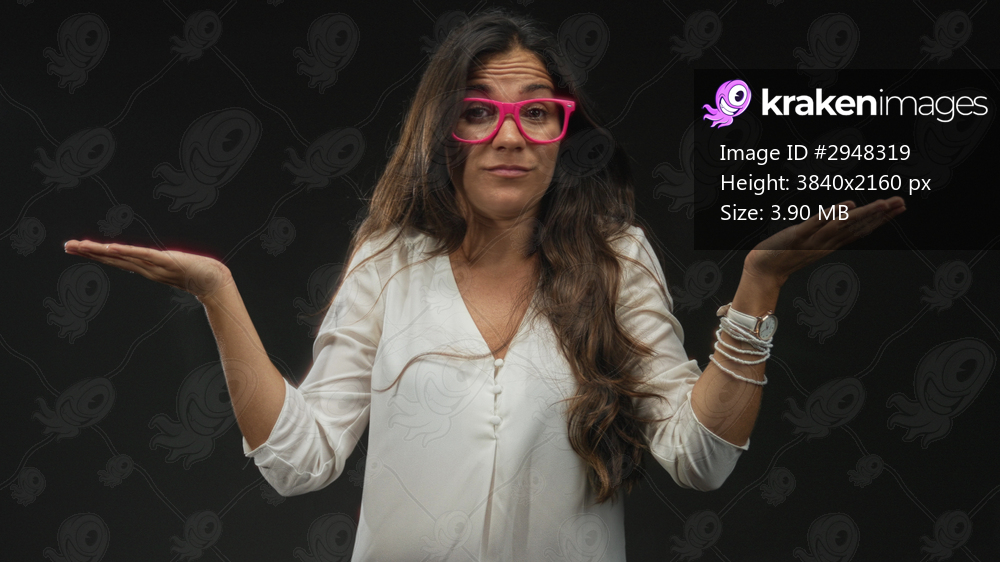 Woman wearing pink glasses with palms up shrug gesture in studio with black background; uncertainty.