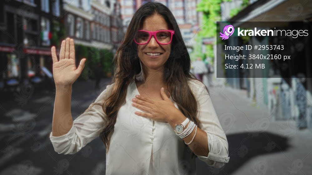 Woman wearing pink glasses raises right hand and places left hand on chest on busy street wearing watch and jewelry; friendly oath.