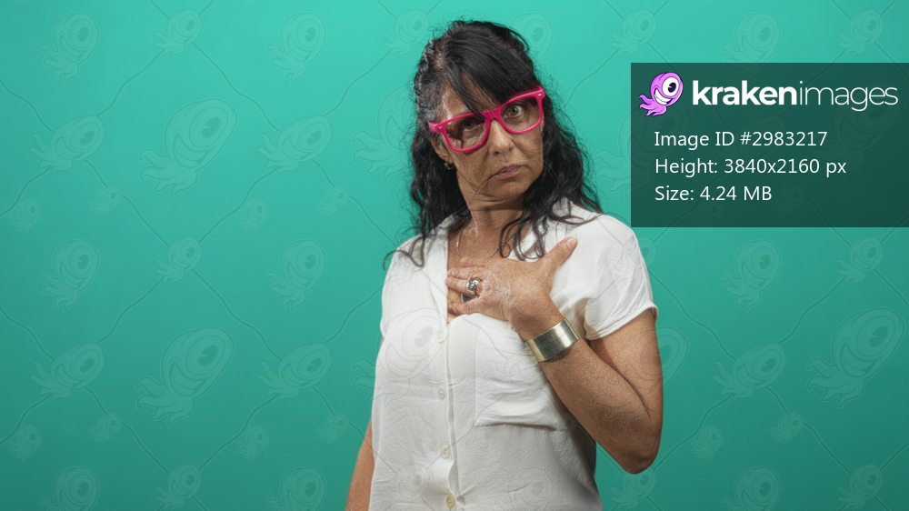 Woman wearing pink glasses touches her chest with one hand in studio showing exposed neckline and jewelry; surprise vulnerability.