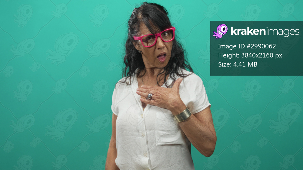 Woman wearing pink glasses touches her chest with one hand in studio showing exposed neckline and jewelry; surprise vulnerability.