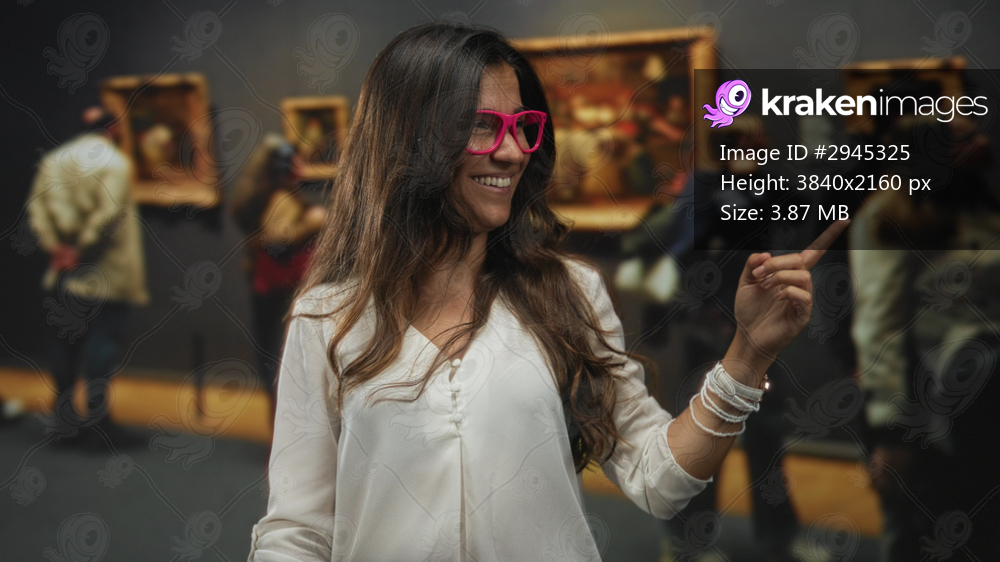 Woman wearing pink glasses and white blouse points finger at painting in gallery among visitors; joy playful curiosity.