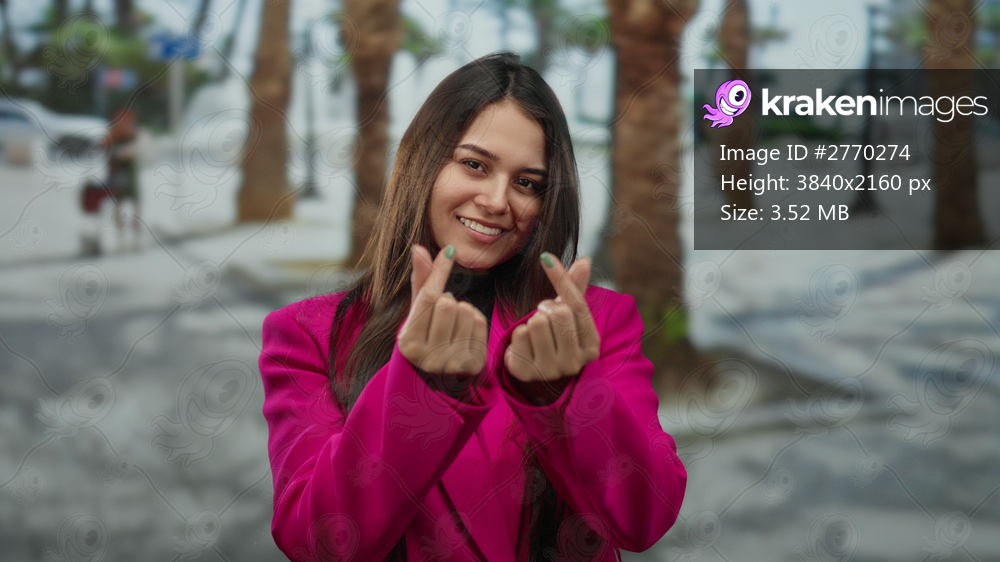 Woman wearing pink jacket makes heart gesture with fingers outdoors on sunny street with palm trees in background, conveying happiness and warmth.