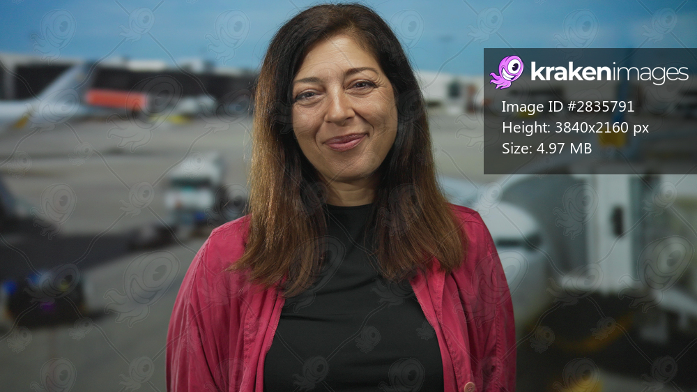 Woman wearing pink jacket smiling in front of airplane at busy outdoor airport terminal; wanderlust.
