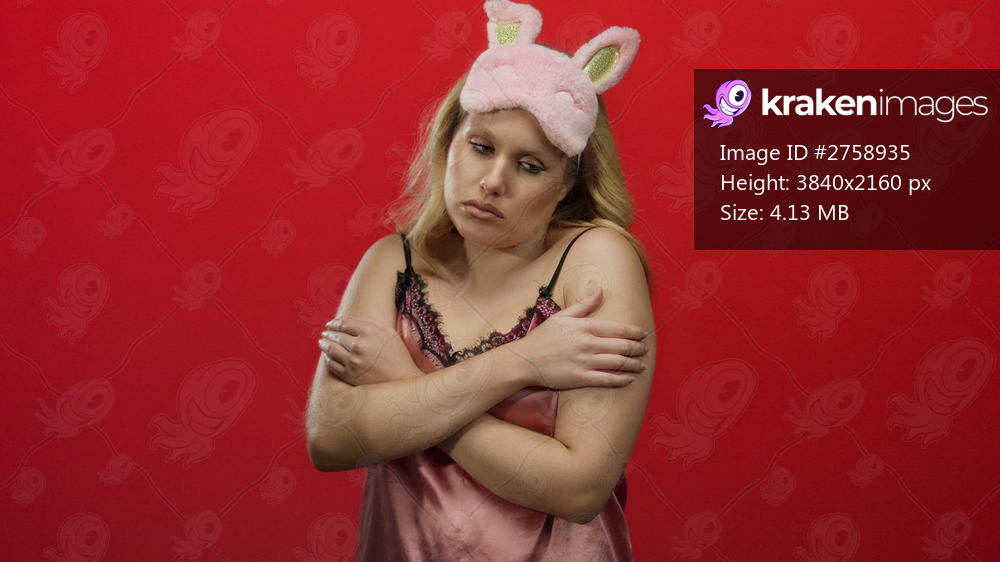 Woman wearing pink nightwear and fluffy sleep mask stands against a vivid red background appearing sleepy and hugging herself.