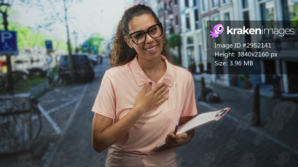 Woman wearing pink polo shirt holding clipboard and pen, hand to chest gesture while standing on a street with parked cars and buildings; warm gratitude. - Kraken Images