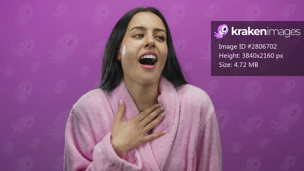 Woman wearing pink robe with surprised facial expressions against a vivid pink background suggests various emotions like shock and excitement in an isolated playful setting. - Kraken Images