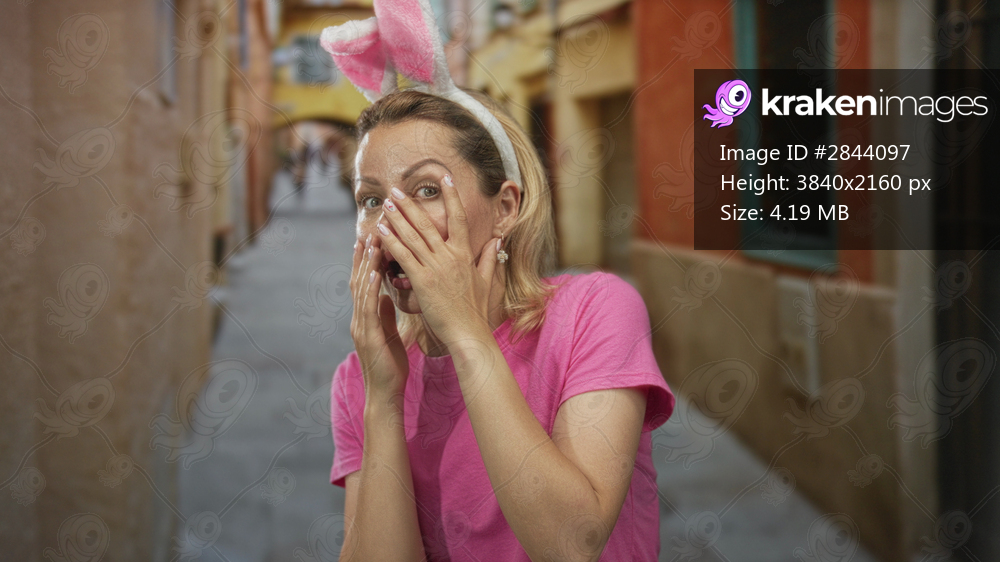 Woman wearing pink shirt and bunny ears headband covers face with hands on old town street; embarrassment.