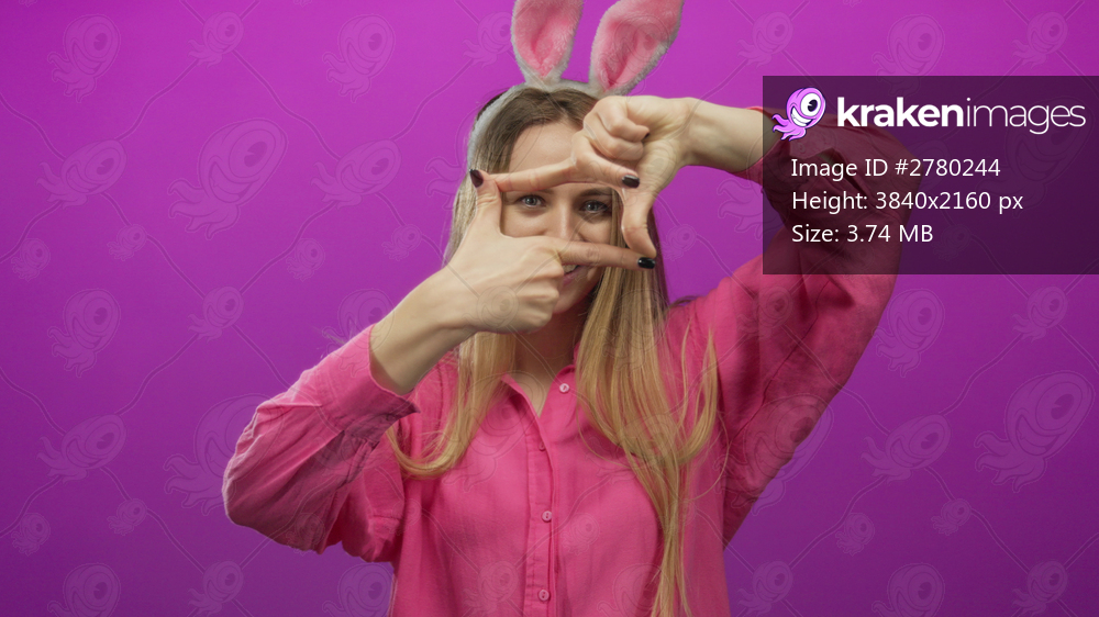 Woman wearing pink shirt with rabbit ears making frame gesture over isolated pink background.