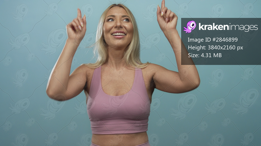 Woman wearing pink sports bra smiling and pointing both index fingers upward in a blue studio; happiness optimism.