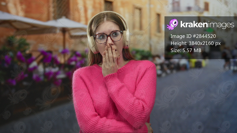 Woman wearing pink sweater, headphones and glasses covers mouth on restaurant terrace outdoors; surprise.