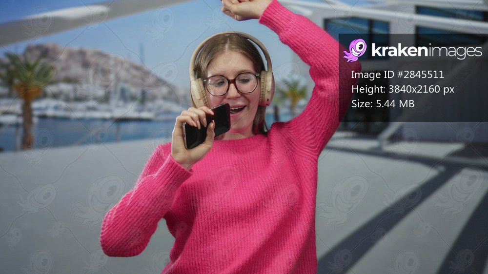 Woman wearing pink sweater headphones and glasses holds phone to mouth and raises hand at building; fun.