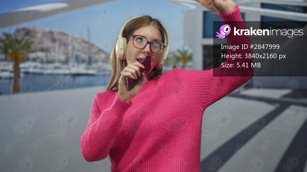 Woman wearing pink sweater headphones and glasses holds phone to mouth and raises hand at building; fun.