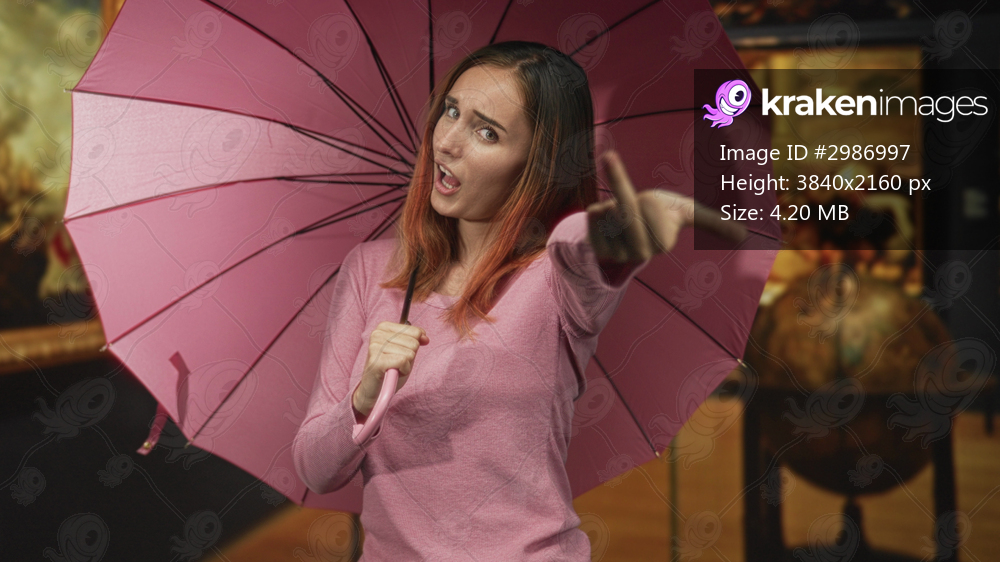 Woman wearing pink sweater holding pink umbrella shows middle finger gesture in building; defiance rebellion challenge.