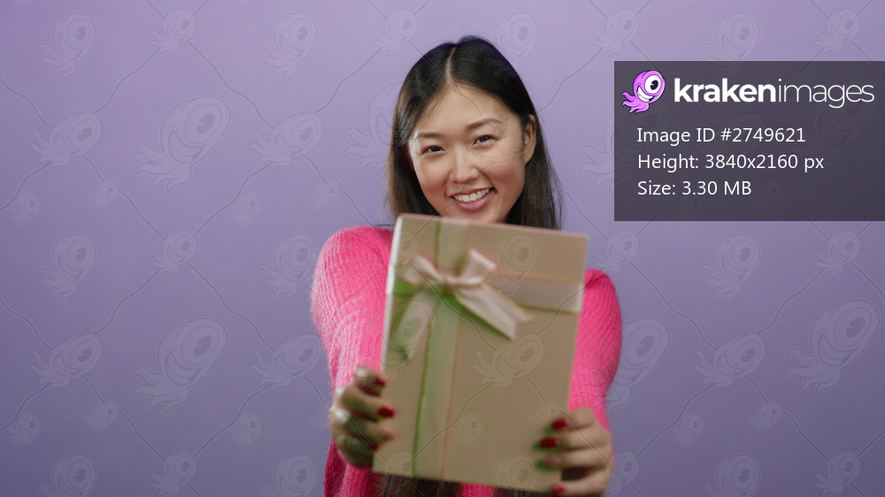 Woman wearing pink sweater holds a gift with ribbon on purple background showcasing joyful expression and anticipation in an isolated setting.