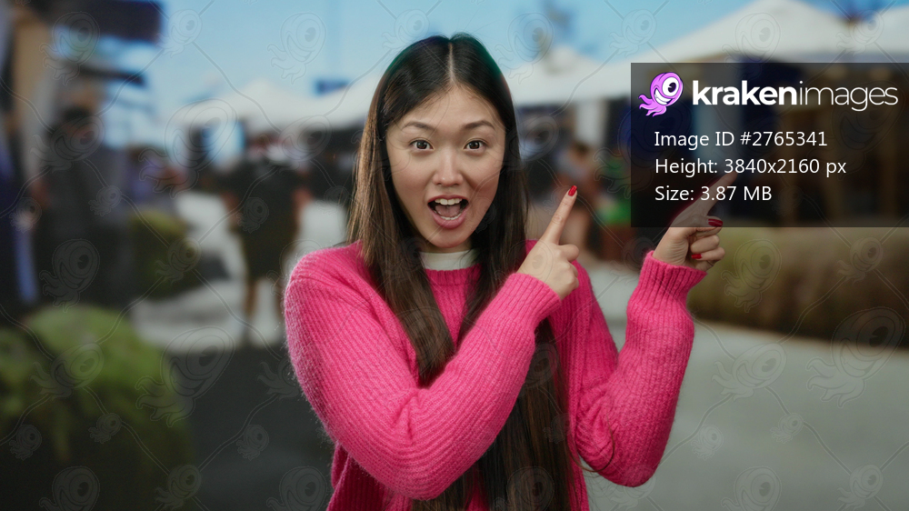 Woman wearing pink sweater pointing outdoors at a bustling market scene, surrounded by people and outdoor stalls, suggesting vibrant shopping experience. - Kraken Images