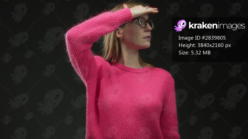 Woman wearing pink sweater shields eyes with hand over forehead in studio with black background; anticipation discovery.
