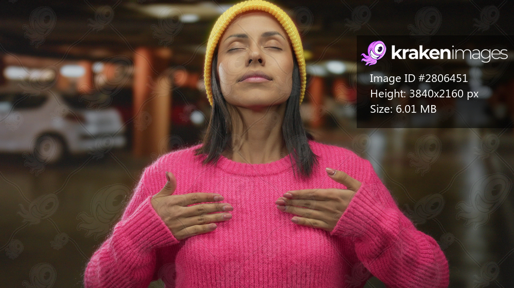 Woman wearing pink sweater and yellow hat stands indoors in parking lot with cars in background, displaying a calm expression suggestive of mindfulness or contemplation. - Kraken Images