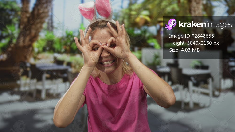Woman wearing pink t-shirt and bunny ears headband making hand binoculars gesture on sunny restaurant terrace outdoors; fun.