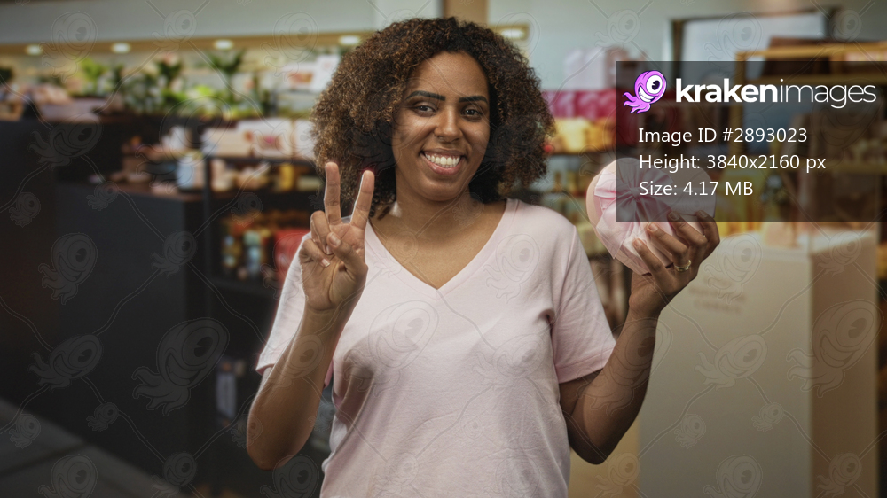 Woman wearing pink t shirt smiling while holding pink heart gift box and showing peace sign in shop; present giving joy.