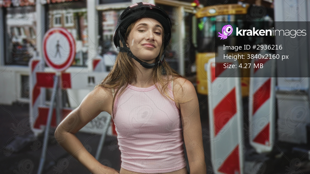 Woman wearing pink tank top and helmet smiling with head tilt on street with construction barriers and pedestrian sign; confidence adventure.