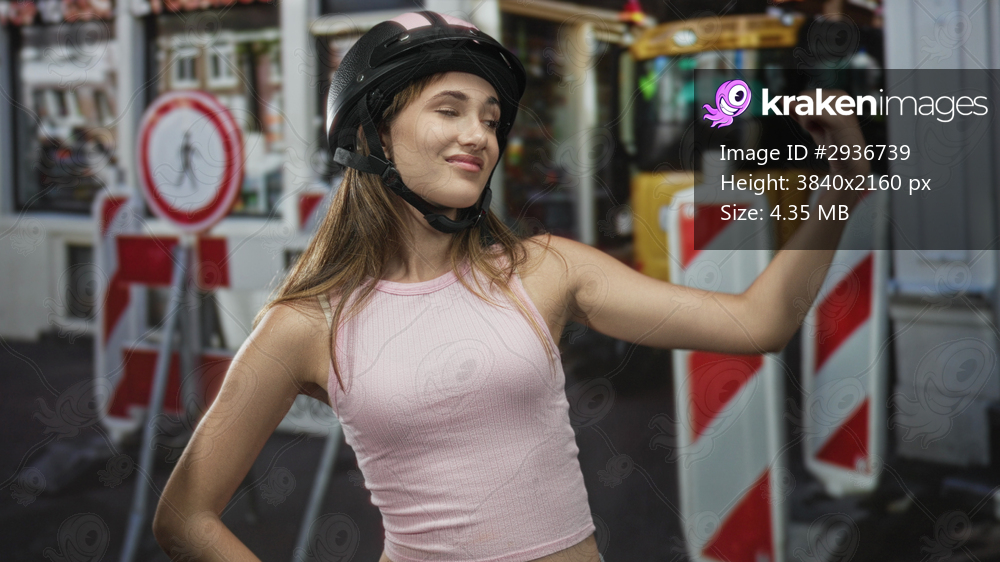 Woman wearing pink tank top and helmet smiling with head tilt on street with construction barriers and pedestrian sign; confidence adventure.