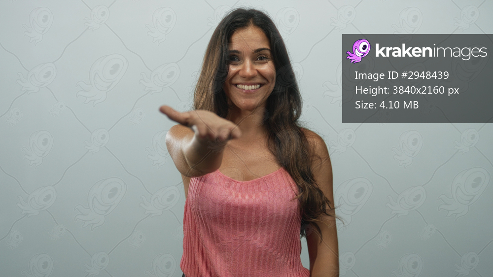 Woman wearing pink tank top smiles broadly and extends hand palm up in studio with pale blue backdrop; warm welcome joy.