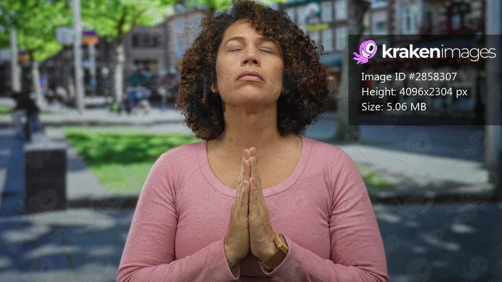 Woman wearing pink top presses hands together in prayer gesture on sunlit urban street with blurred buildings; serenity.