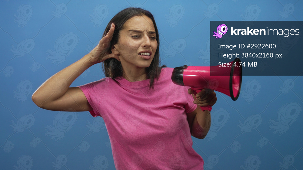 Woman wearing pink tshirt holds pink megaphone and cups ear in blue studio; frustration attention communication.