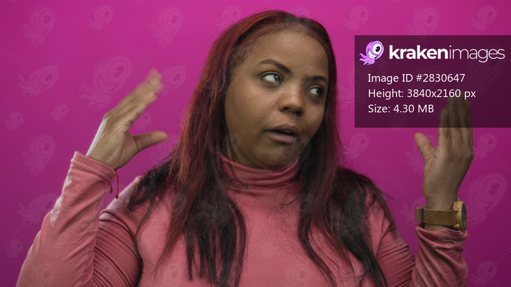Woman wearing pink turtleneck rolls her eyes skyward and lifts both hands in a bright studio setting; frustration.