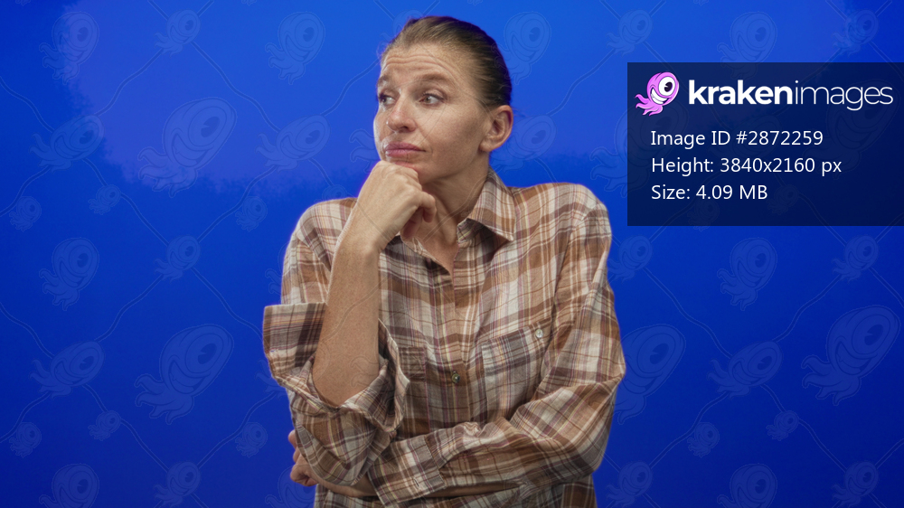 Woman wearing plaid shirt with hand on chin and folded arm, looking up in blue studio set framed from waist; pensive thought curiosity.