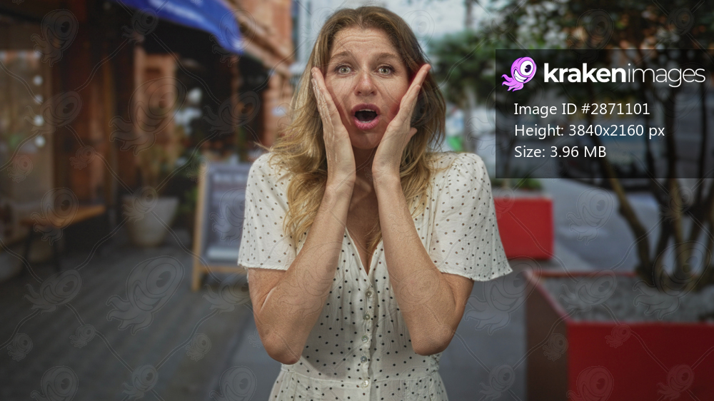 Woman wearing polka dot dress with hands cupping cheeks and mouth open on street storefront; surprise reaction moment.