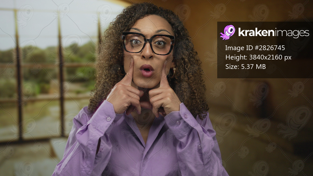 Woman wearing purple shirt and black glasses points fingers to puffed cheeks in living room under soft daylight; playfulness.