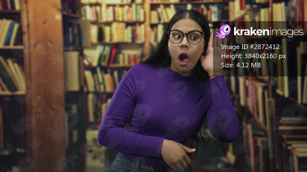 Woman wearing purple sweater cups her ear with her hand while leaning in front of bookshelves in library; curiosity.
