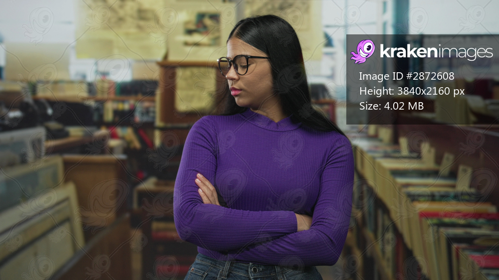 Woman wearing purple sweater and glasses crossing arms with visible face in library amid wooden shelves; rejection.