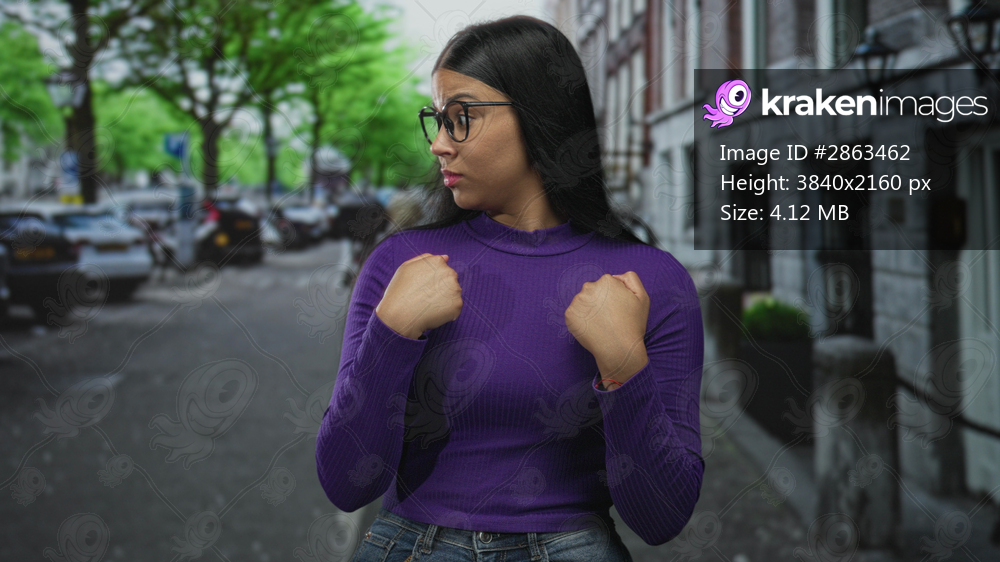 Woman wearing purple sweater pointing fingers to chest on street clad in denim jeans with glasses visible; surprise reaction.