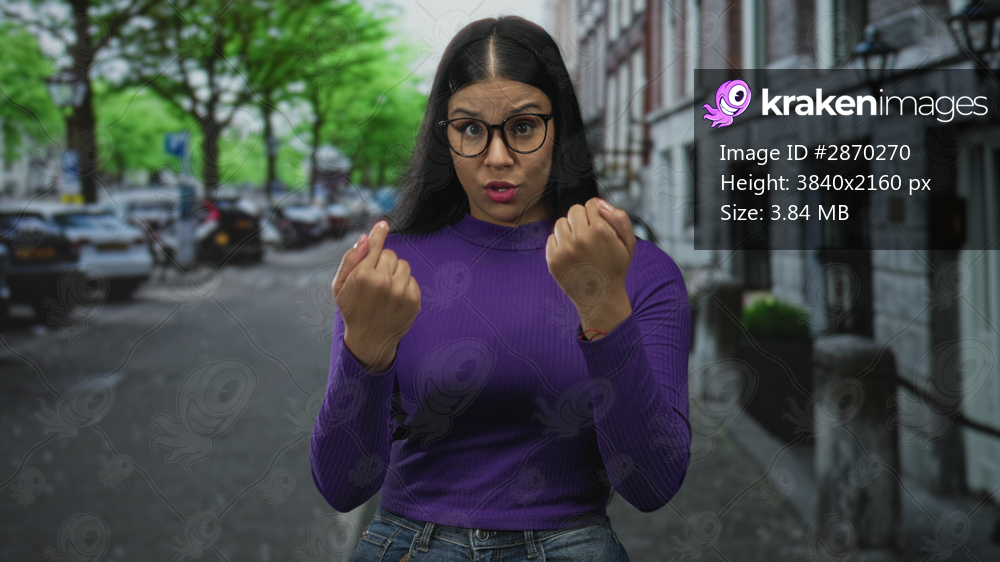 Woman wearing purple sweater pointing fingers to chest on street clad in denim jeans with glasses visible; surprise reaction.