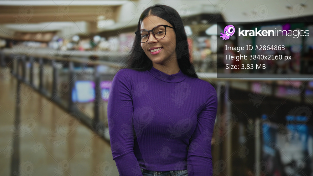 Woman wearing purple top adjusting eyeglasses with both hands by railing in mall indoors; confidence poise.