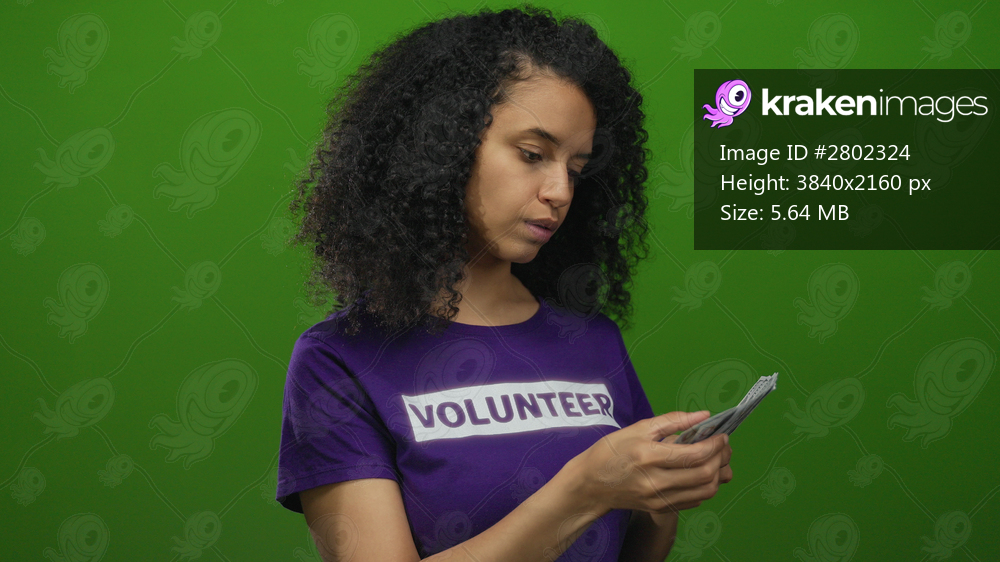 Woman wearing purple volunteer shirt holding us dollars against green background isolated