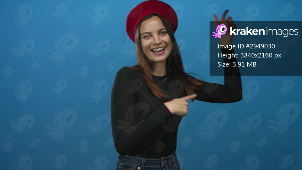 Woman wearing red beret and black top pointing index finger and smiling while gesturing to the side in blue studio; playful.