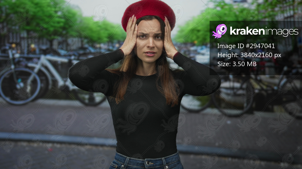 Woman wearing red beret pressing hands to temples with eyes closed for headache on street in amsterdam; anxiety overwhelm.
