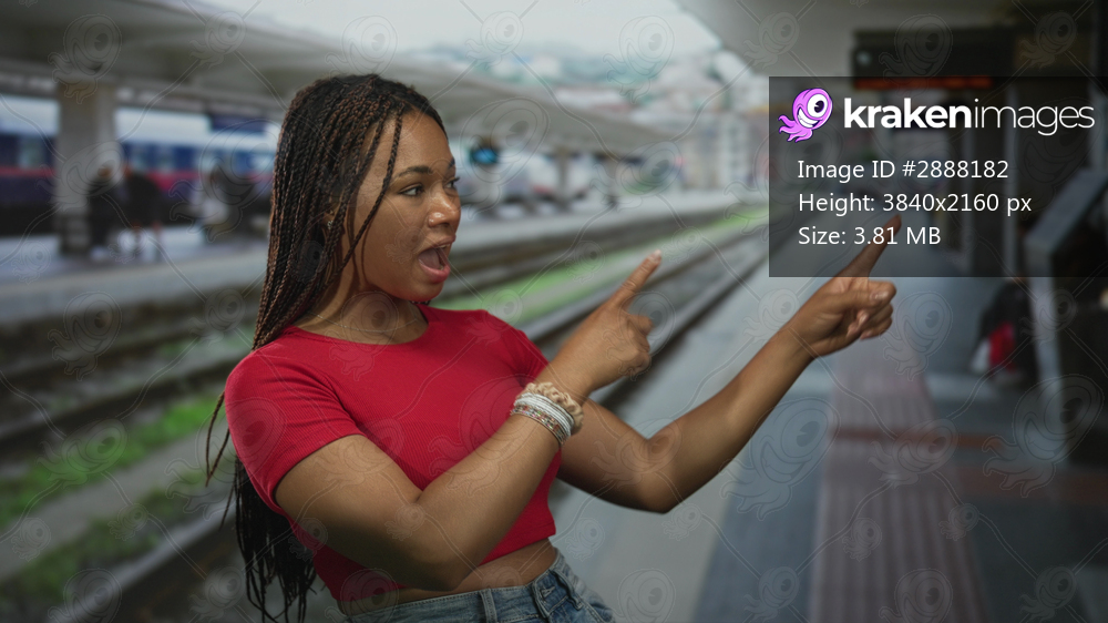Woman wearing red crop top and jeans pointing both fingers on train platform building; playful confidence travel.