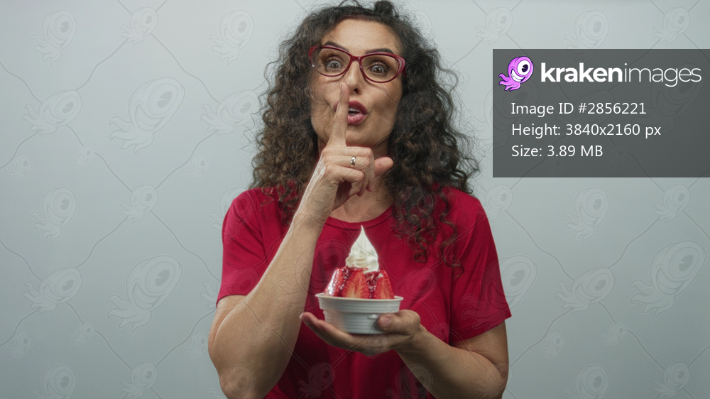 Woman wearing red eyeglasses and red shirt holds strawberry bowl with softserve and finger to lips for silence in studio; secrecy indulgence.