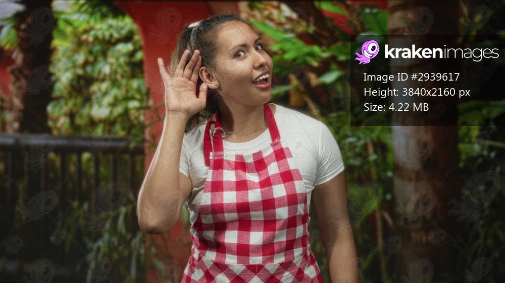 Woman wearing red gingham apron cupping hand to ear at building entrance near palm and railing, listening gesture in outdoor scene; curiosity.