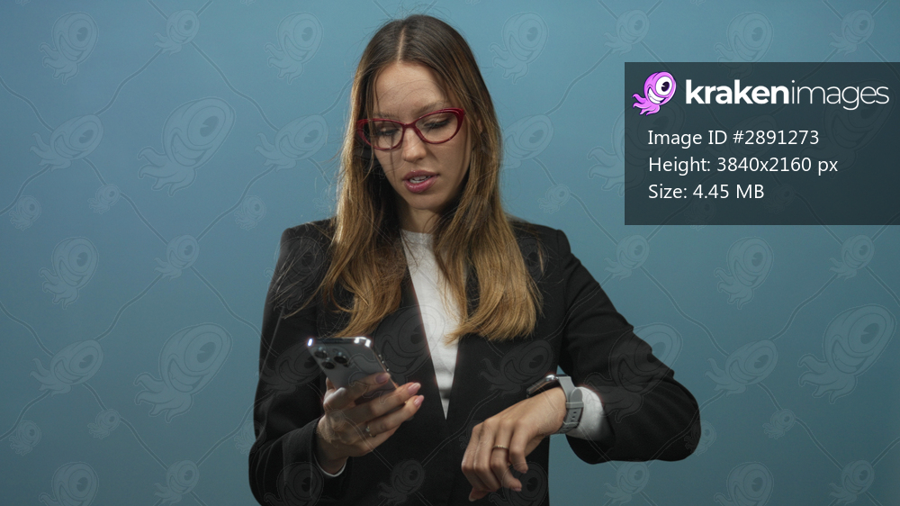 Woman wearing red glasses and black blazer checking smartwatch and holding smartphone in blue studio; focused punctuality.