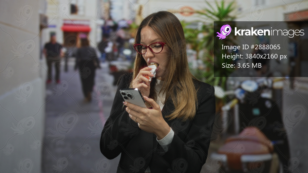 Woman wearing red glasses and black blazer holds smartphone while eating a wrapped snack on a busy city street; urban routine focus.