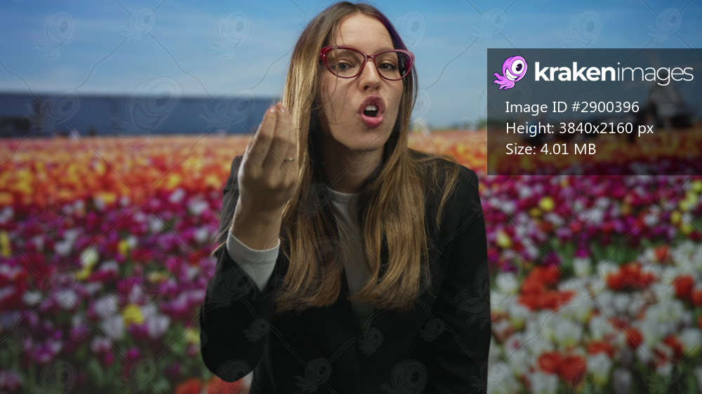 Woman wearing red glasses and black blazer making pinched hand gesture with visible hand in studio tulip field; frustration resilience.